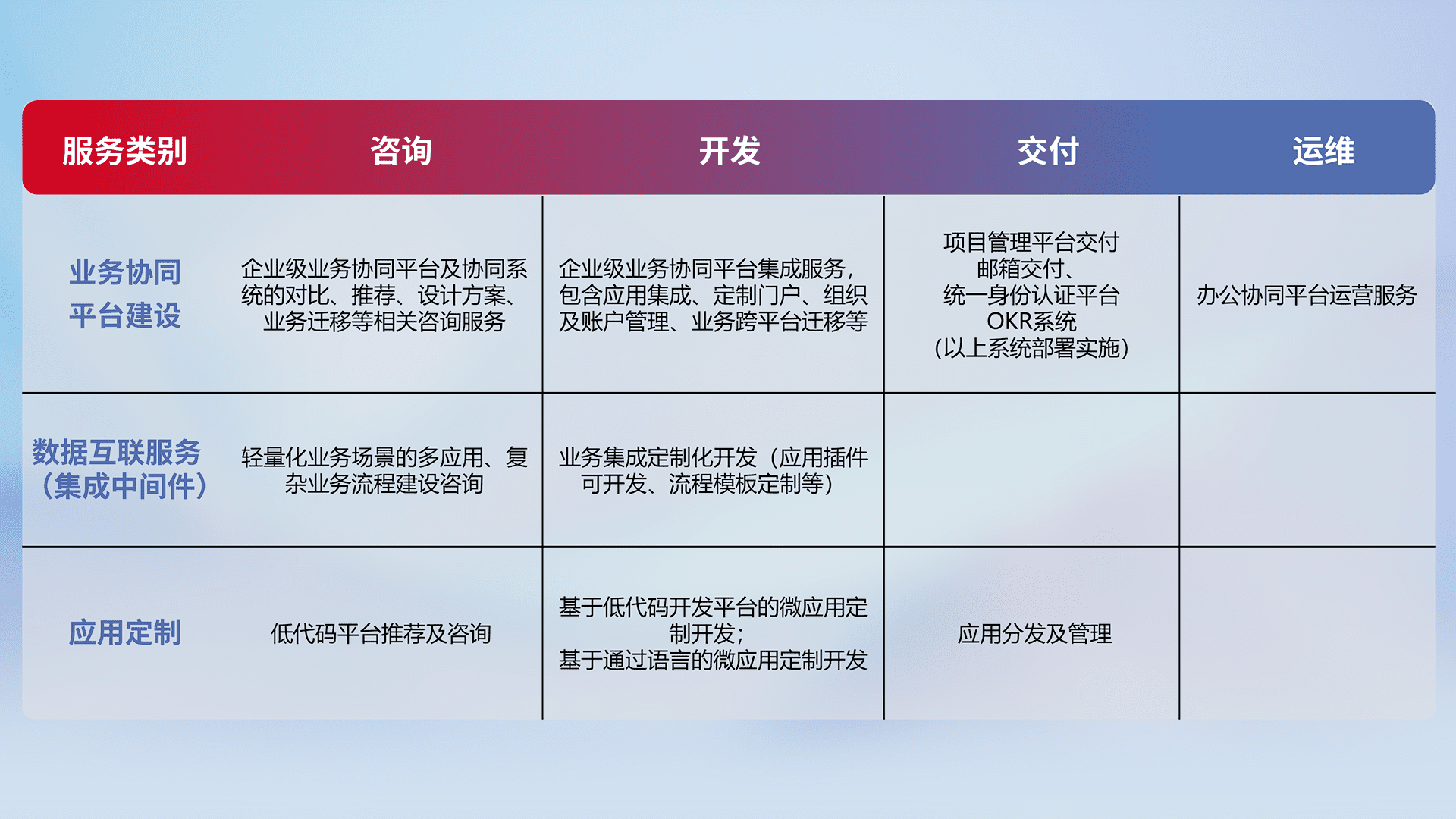 针对钉钉、、、、企微、、、、IDaas等平台级产品提供产品的规划、、、、方案、、、、交付、、定制化开发等服务,,实现如统一协同办公、、、、智能客户服务、、混合会议管理、、、、智能数据查询、、、等业务场景,,,实现数字化转型。。