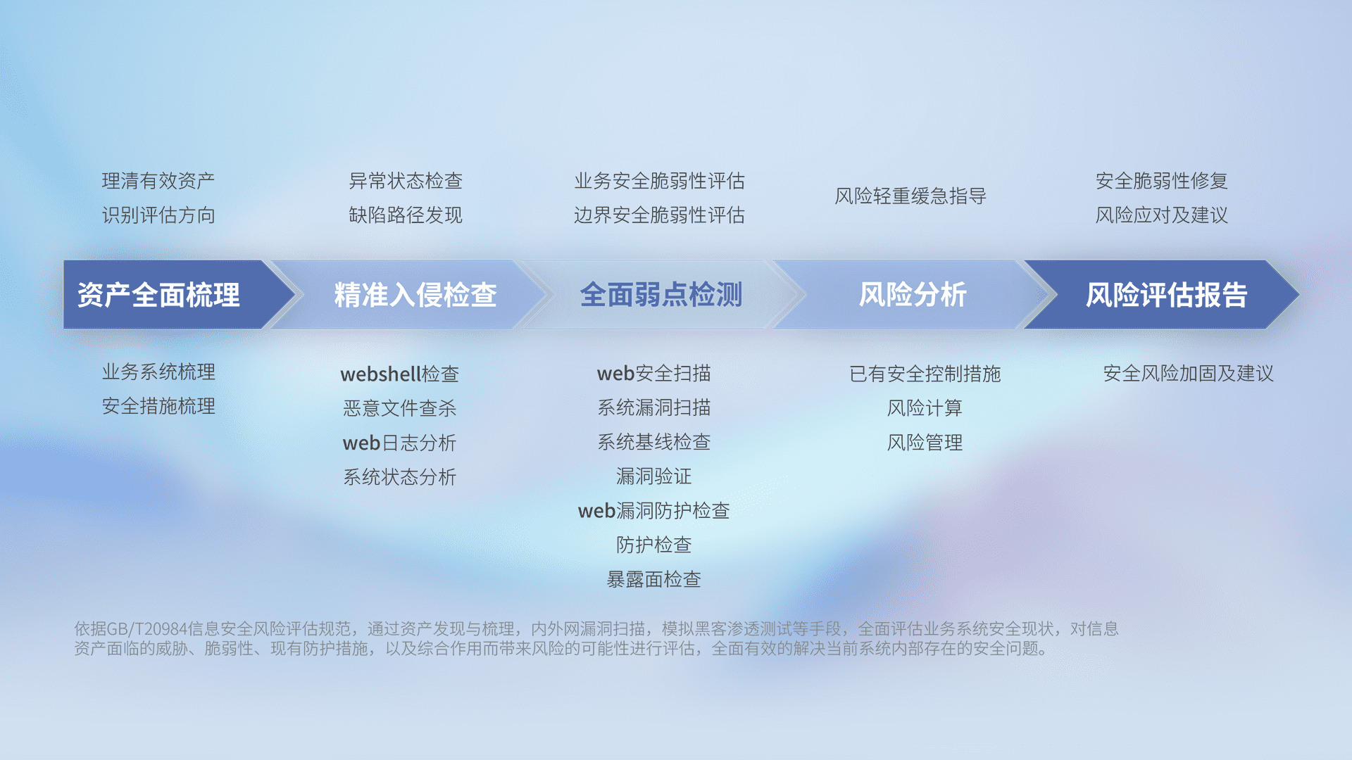 针对客户行业特性,,,以专业的安全服务+多厂商联合解决方案提供专属的一站式安全管理服务,,,帮助客户全面感知网络空间威胁,,,,基于识别、、、检测、、、分析、、防护、、、监测、、响应的服务理论模型,,从方案咨询、、、、集成交付、、、评估验证、、、、优化加固、、运维运营,,,致力于为客户提供完整的闭环管理式安全服务。。。。以实战经验为客户打造高抵御风险的安全体系,,,,帮助客户发现威胁、、对抗威胁、、、处置威胁,,不断积累安全对抗能力,,,,持续保障数字化安全。。